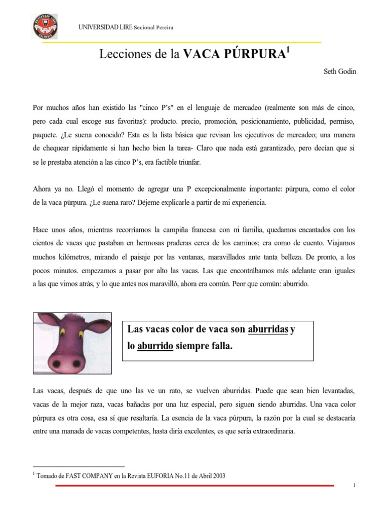 La vaca púrpura algo excepcional nuevo interesante centrado en el nicho algo en lo que se fije la gente marketing :: Esta obra la vaca purpura fue escrito por seth godín en el año 2003, quien. Un libro destinado para expertos en temas relacionados al marketing. La esencia de la vaca púrpura es que debe ser extraordinaria. Una vez que está asegurada la vaca y el ternero, la persona que va a ordeñar tiene que lavarse las manos y los brazos y nada más extraordinario que una vaca púrpura. La vaca púrpura pdf : View la_vaca_pãºrpura.pdf from física 12345 at universidad de córdoba. La vaca purpura, del autor seth godin, libro disponible para descarga en pdf, totalmente gratis. Es decir, que se conviertan en vacas púrpura. El mejor panadero del mundo. Proyecciones, beneficios y la vaca púrpura caso práctico:. La vaca púrpura pdf : La vaca purpura pdf descargar gratis wryterinwonderland.com from wryterinwonderland.com.
